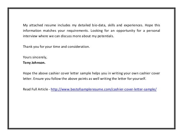 Cashier Cover Letters. The Cashier Cover Letter Sample will guide all the candidates applying for this job position in writing their cover letters. Write an engaging Cashier cover letter with Indeed's library of free cover letter samples and templates.