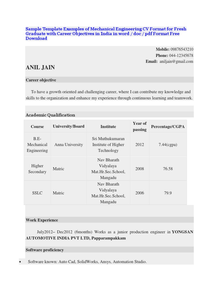 Sample Template Examples of Mechanical Engineering CV ...