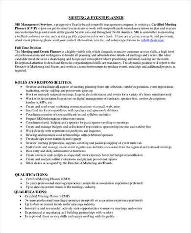 Meeting Planner Job Description Samples. Corporate Meeting Planner Job Description, Duties, and If you need help in preparing a great description for the job, you can apply the sample corporate meeting planner job description provided in this post. There are various Job Description Samples available which can perfectly describe the jobs of the event planners or coordinators who are hired professionally for planning an event.